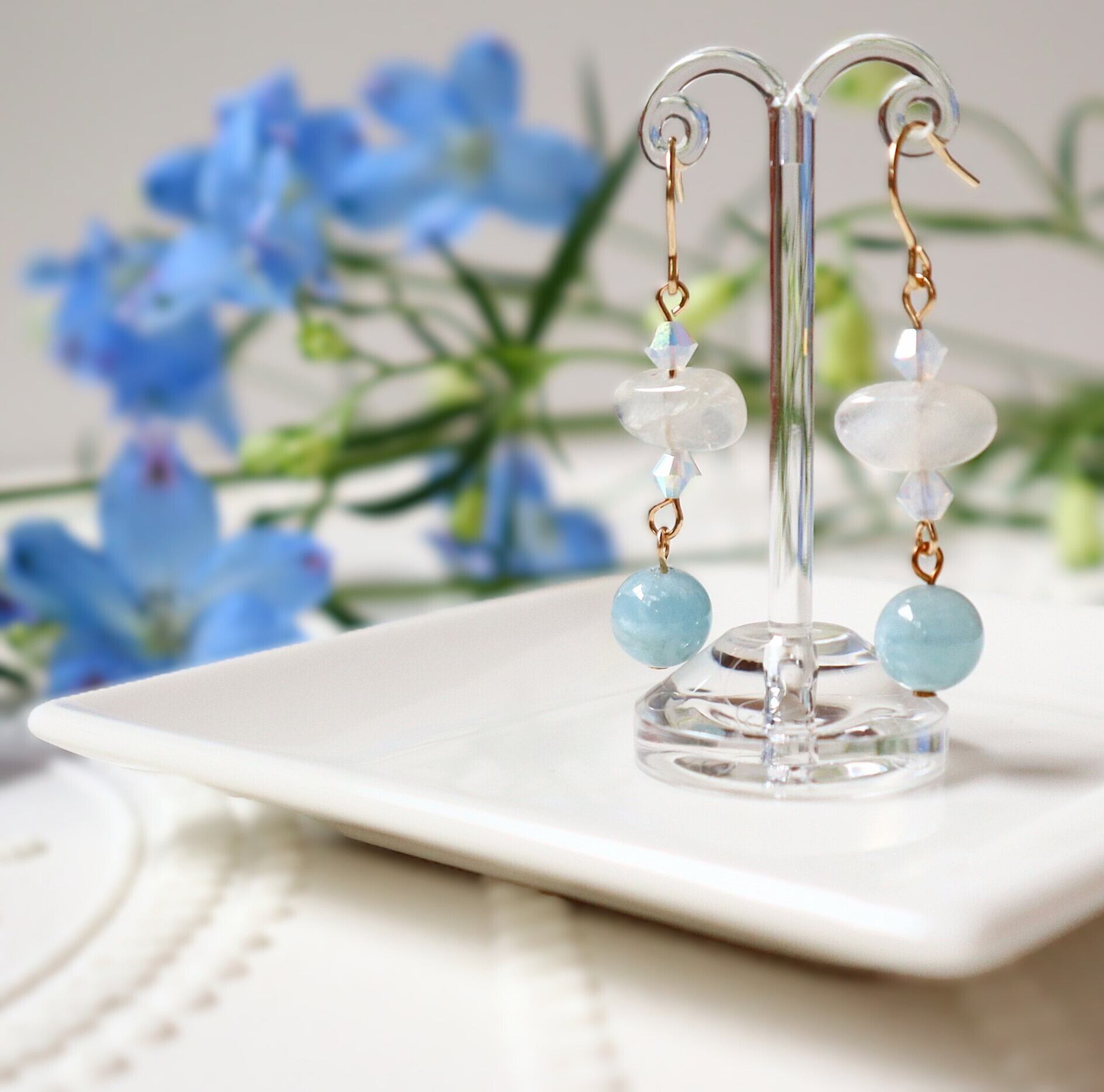 このピアス・イヤリングは、ホワイトムーンストーンとアクアマリンを組み合わせることで、“大切な人との深い絆”という意味を込めました。