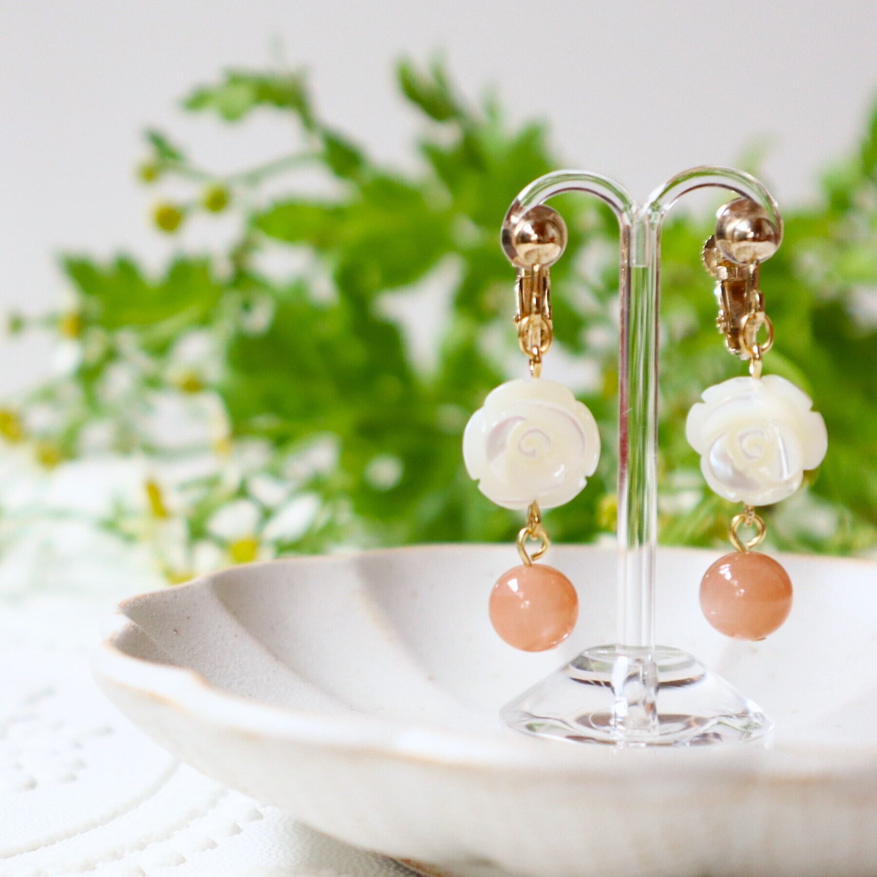 薔薇の形のマザーオブパールに、オレンジ色のムーンストーンを組み合わせたピアス・イヤリングです。