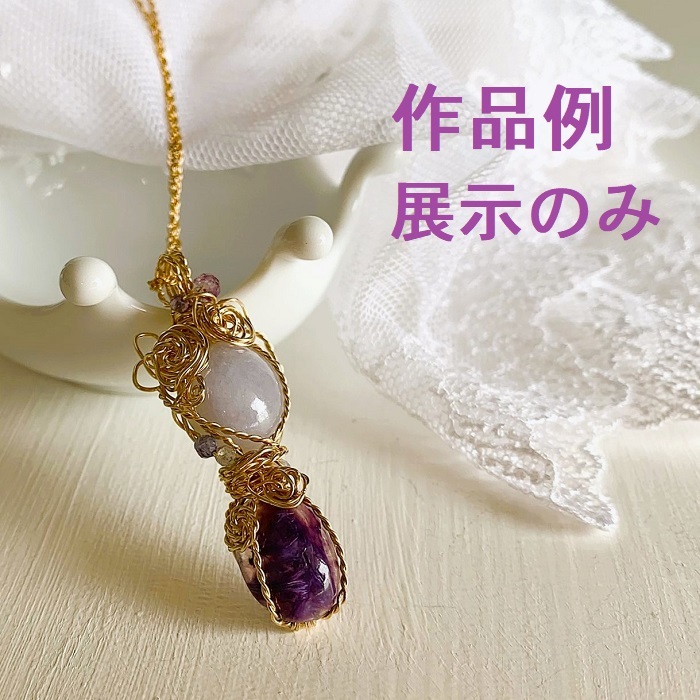 濃い紫色のチャロアイトと、薄い紫色のティファニーストーンを14kgfのワイヤーで包み、つなげたペンダントトップです。