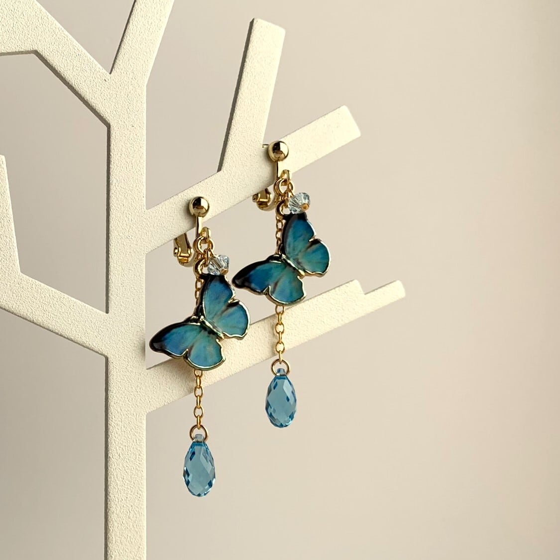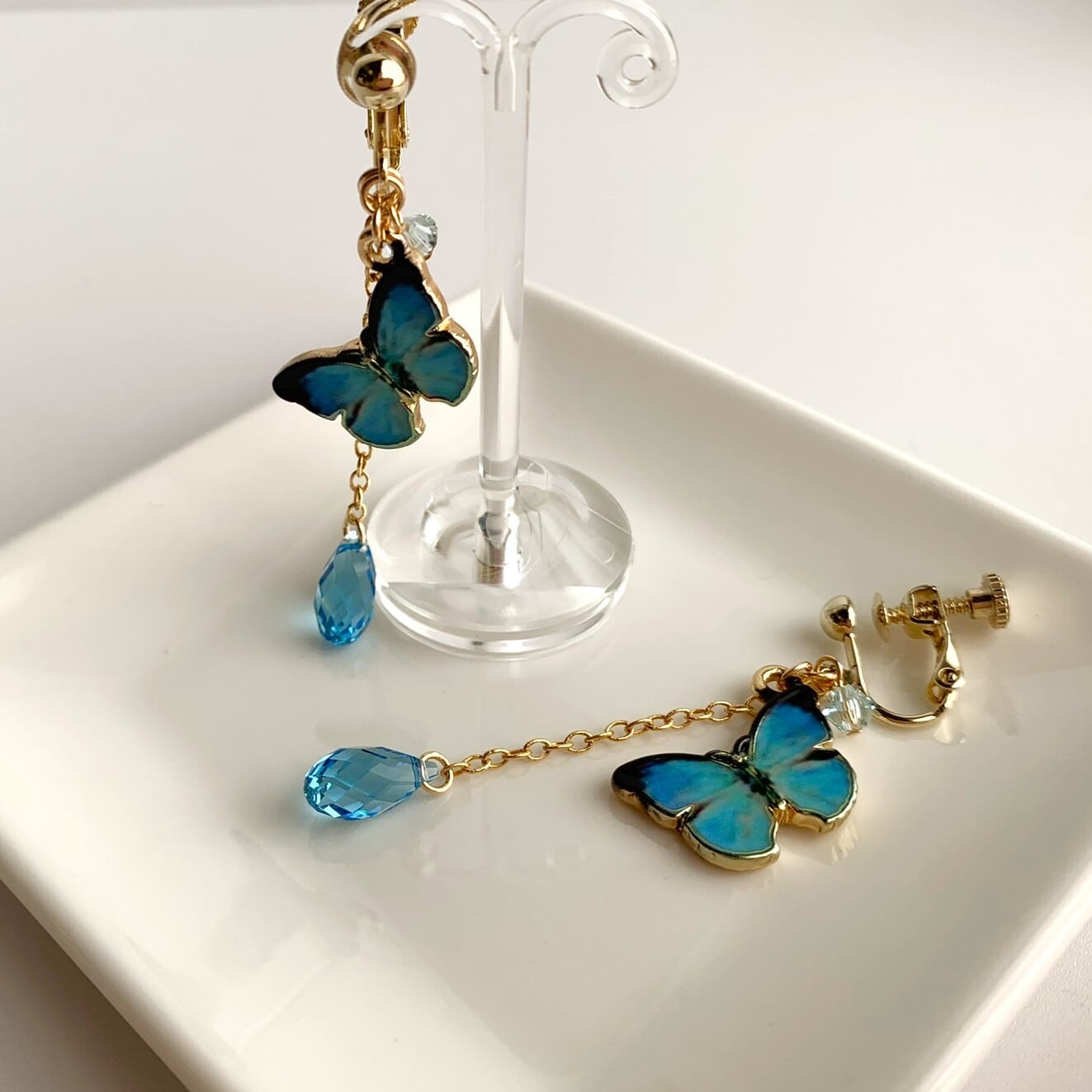 【使用したパーツ】モルフォ蝶パーツ約15mmx20mm、スワロフスキーエレメント(しずく型)約5×11㎜